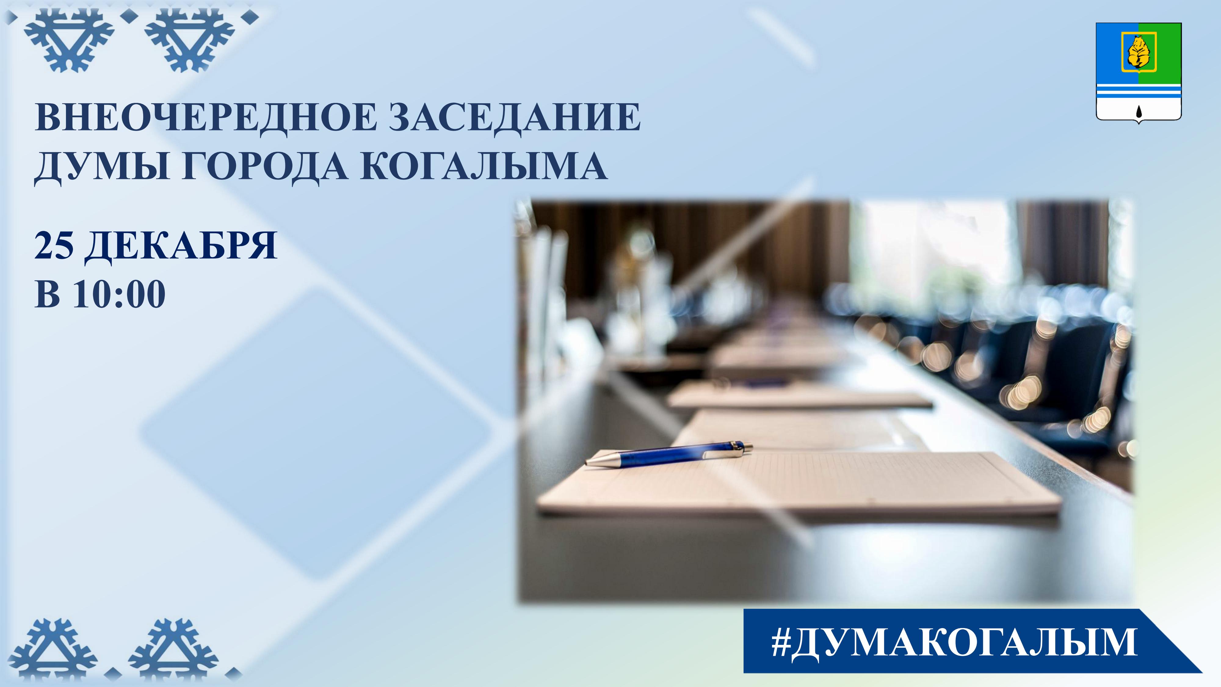 Внеочередное заседание Думы города Когалыма состоится 25 декабря 2024 года в 10 часов 00 минут в здании Администрации города Когалыма по адресу: город Когалым, улица Дружбы Народов, дом 7, кабинет 229.