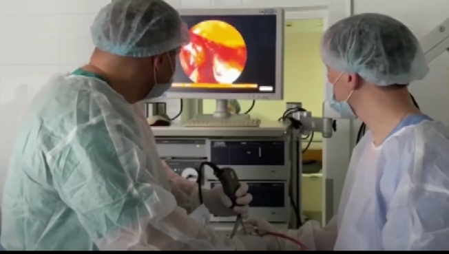 «Операция проводится в два этапа. Первым этапом делается эндоваскулярный этап в отделении рентгенхирургии под специальным аппаратом, ангиографом экспертного класса. Мы делаем в бедренной артерии и катализируем сосуд, который кровоснабжает именно вот эти доброкачественные опухоли в околоносовых пазухах. То есть такая достаточно тонкая операция, когда проводится катетер сначала в общую сонную артерию, потом в наружную сонную артерию, потом в верхнюю челюстную артерию диаметром 2-3 миллиметра», – рассказал заведующий отделением рентгенохирургических методов диагностики и лечения СОКБ Павел Кан.